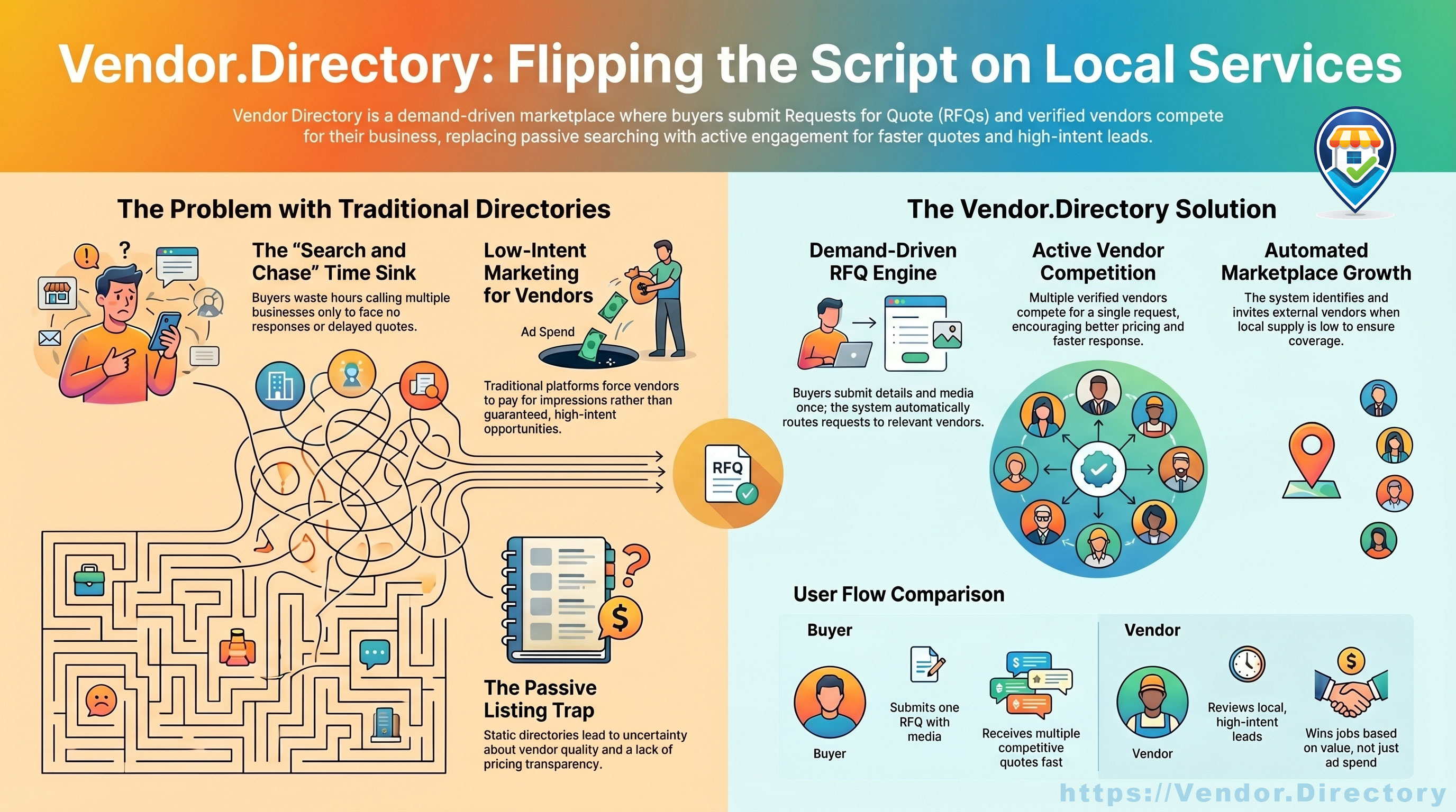 The traditional model treats the buyer as an applicant, pleading for a vendor’s time. But a new architectural shift is occurring. Vendor.Directory isn't just another directory; it is a structural "reverse" solution designed to dissolve these inefficiencies. It marks the transition from a passive, ad-heavy ecosystem to a live, demand-driven marketplace.